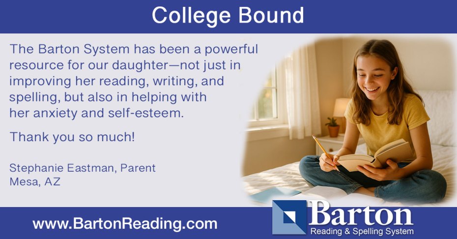 I love your newsletters! My 17-year-old daughter, Alyssa, is currently in Level 8 of the Barton Reading & Spelling System, and it has made such a difference in her life. Before starting Barton, she went through the Wilson program at a private school she attended from 1st to 6th grade. The Barton System has been a powerful resource for our daughter—not just in improving her reading, writing, and spelling, but also in helping with her anxiety and self-esteem.