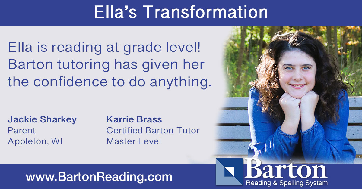 The Barton Reading & Spelling System has truly helped our daughter. The transformation has been remarkable. Today, Ella is reading at grade level! Barton tutoring has given her the confidence to do anything. We are so thankful to you, the staff at DRC, and Ms. Karrie — her incredible tutor.
