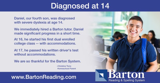 We immediately hired a tutor using the Barton System. Daniel made significant progress in a short time and grew in both his reading skills and his self-confidence.