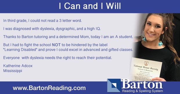 Susan Barton loves getting letters from graduates of the Barton Reading & Spelling System who then start sharing their story in an effort to change things for other students with dyslexia. Here’s Katherine’s story: