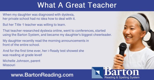She started researching dyslexia, went to meetings and conferences, eventually became certified in the Barton System, and she has been one of my daughter’s biggest cheerleaders. She has even given up her own summer vacations in order to tutor Ashten year round for 2 1/2 years.