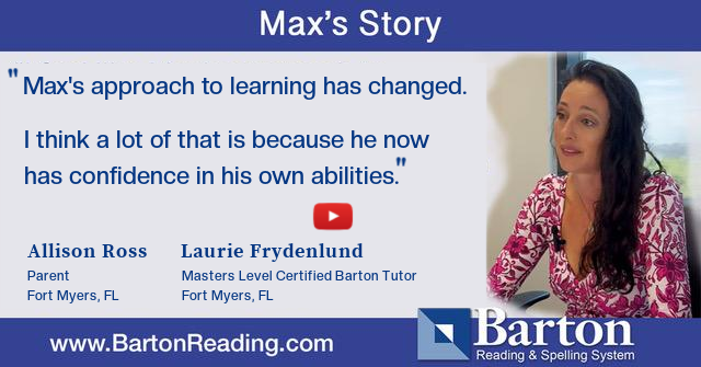 Laurie gave Max a space where he felt safe and successful. She also gave me the tools to support him at home. I can’t say enough about her and the Barton Reading & Spelling System.